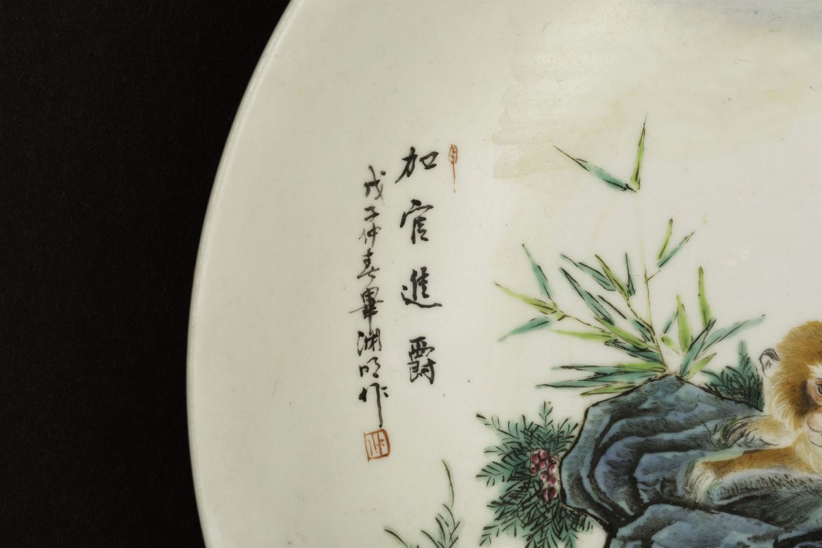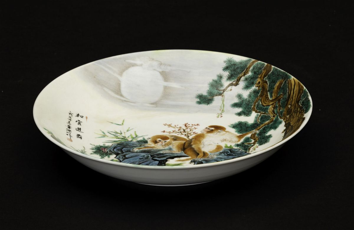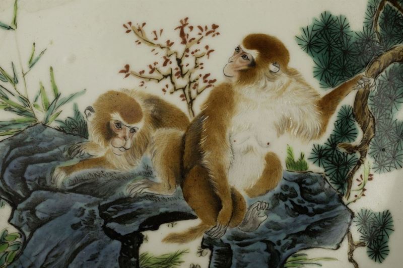 Polychrome enamels depicting monkeys with inscriptions. Diam. 23cm