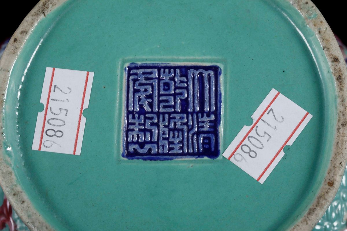 A small vase with polychrome enamels with depictions of wise men and Pho dogs in relief, from the Guangxu period (1875-1908). H 25cm
