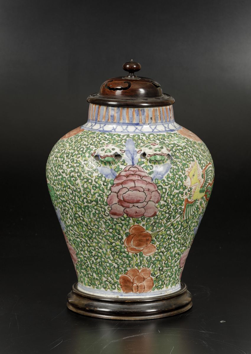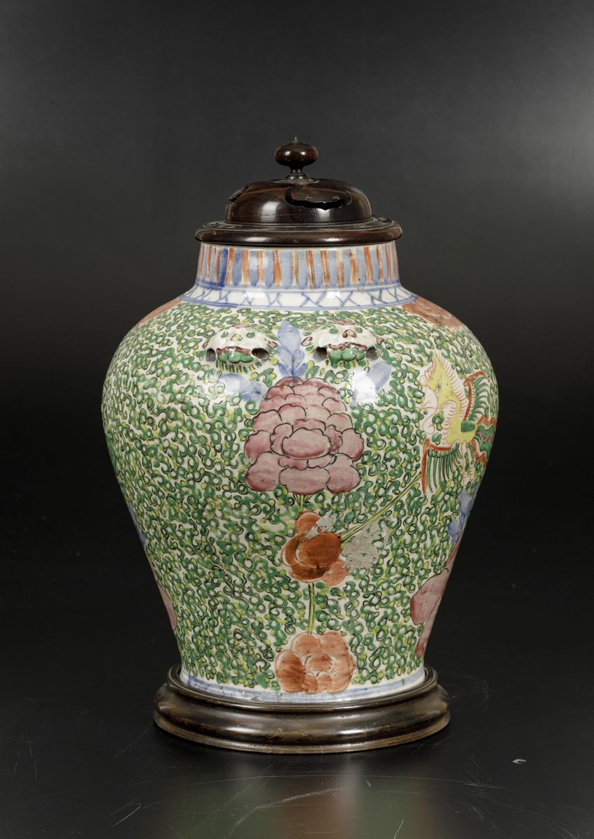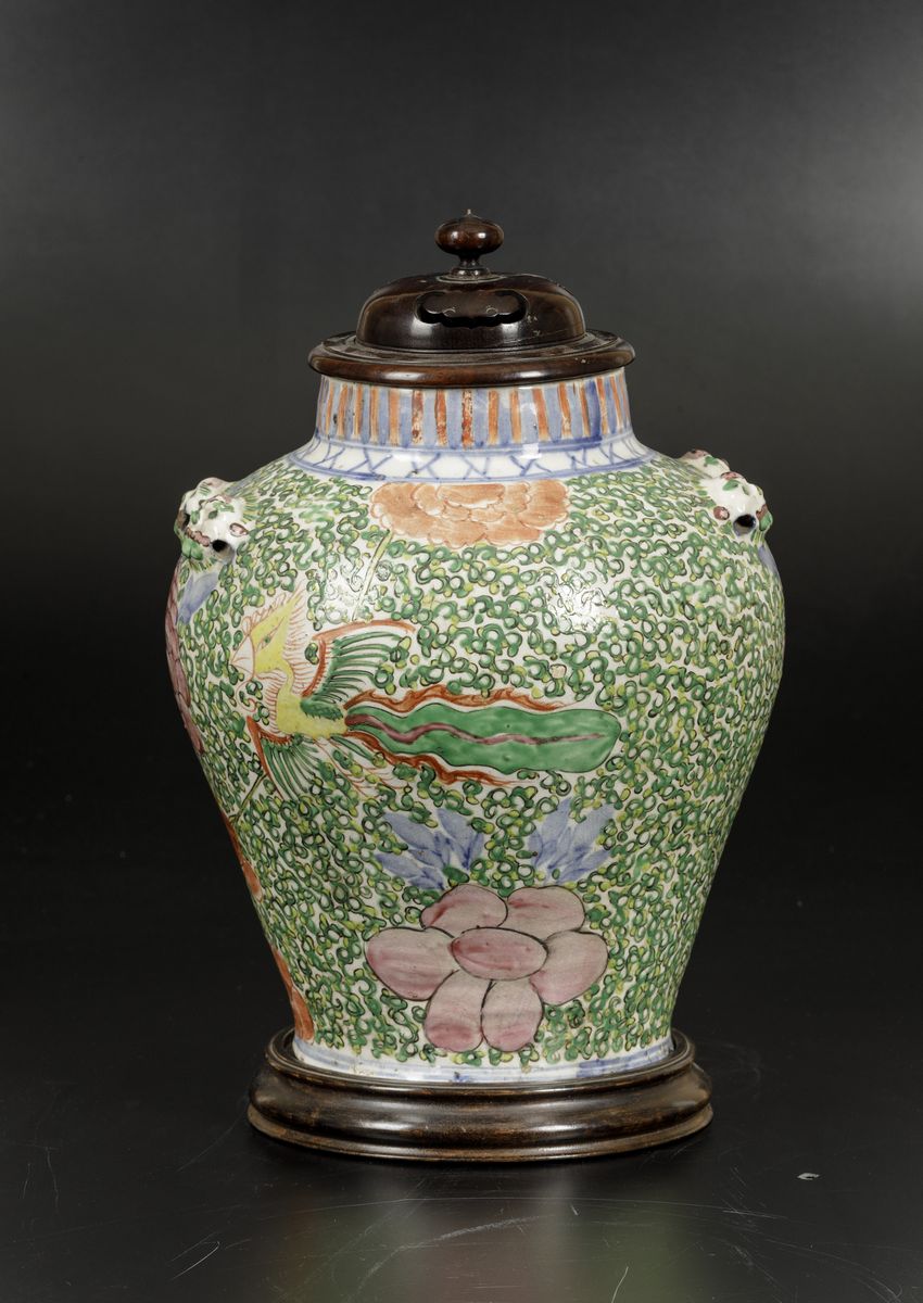 A vase in porcelain of the Famille-Verte with phoenix figures, flower decorations and mascarons. H 40cm