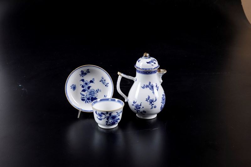 Qianlong period (1736-1796). A milk jug, a cup and a plate in white and blue porcelain with a floral decor and gilded profiles. Milk jug:H 16.5cm; cup: H 8cm; plate: diameter 12cm
