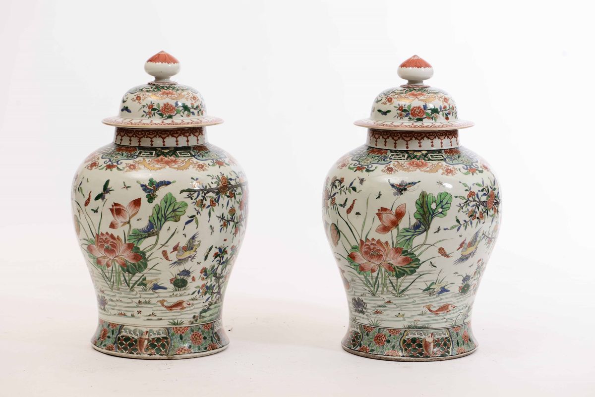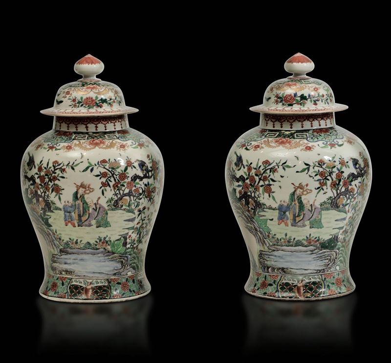 Green Family porcelain with a floral decor and everyday life scenes. H 66cm