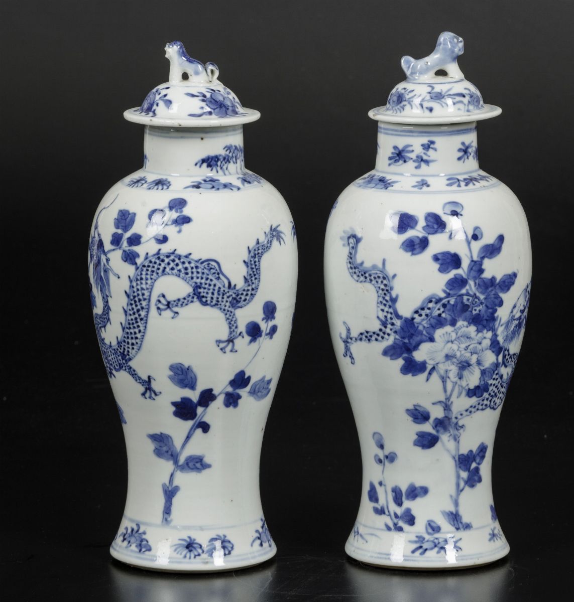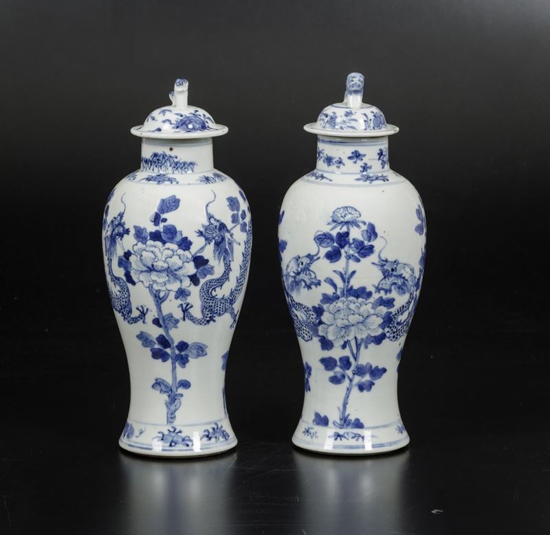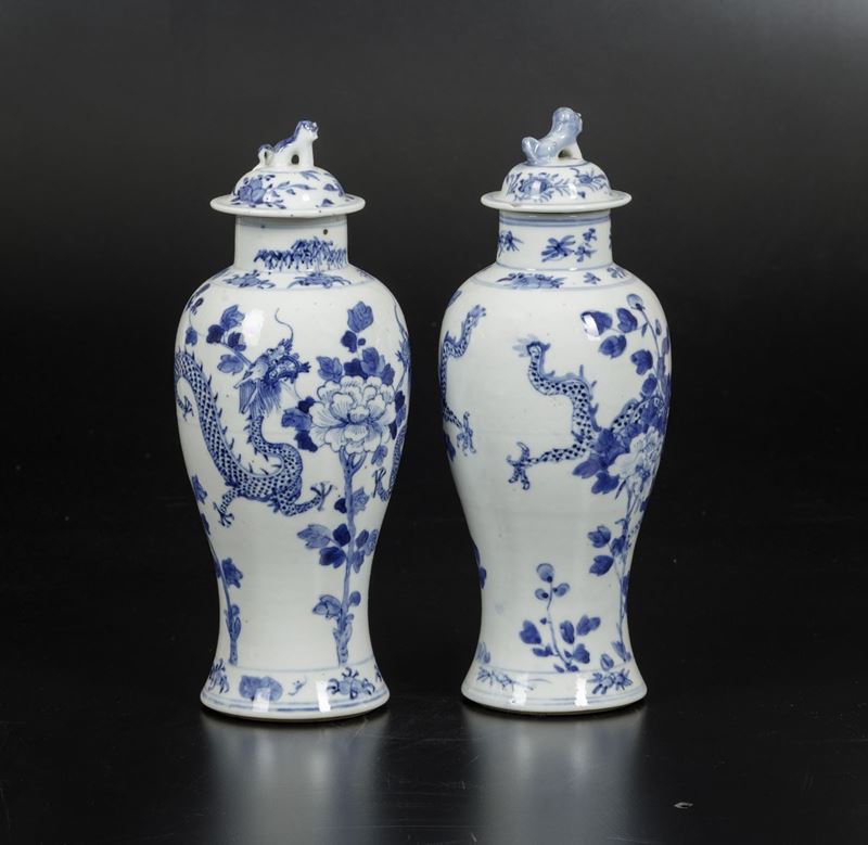 White and blue porcelain with dragons and floral decors. H 35cm