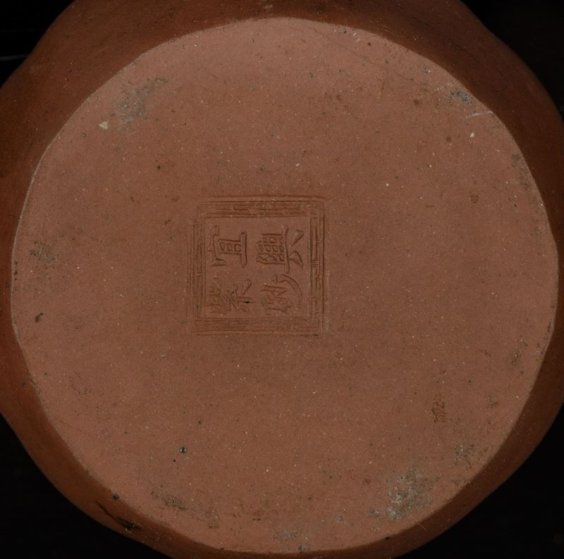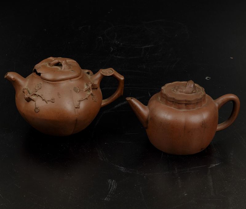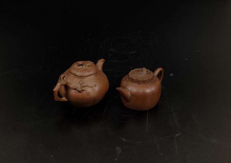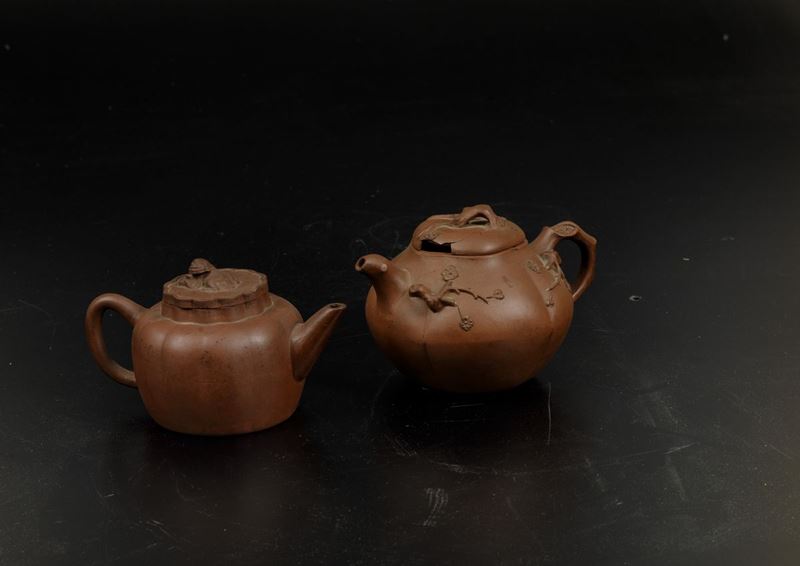 Two teapots in Yixing porcelain with elements in relief. H from 9 to 11cm