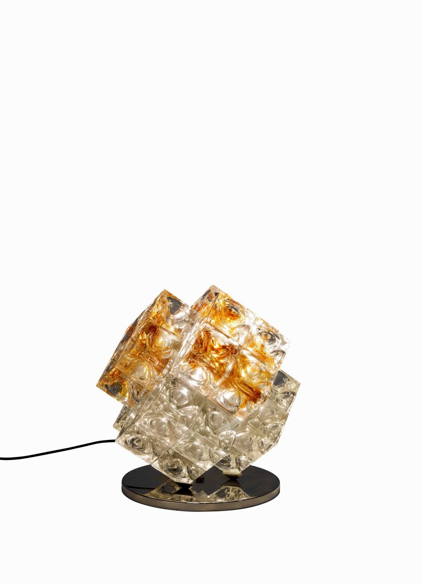 Lampada da tavolo con struttura in metallo e diffusore in vetro.