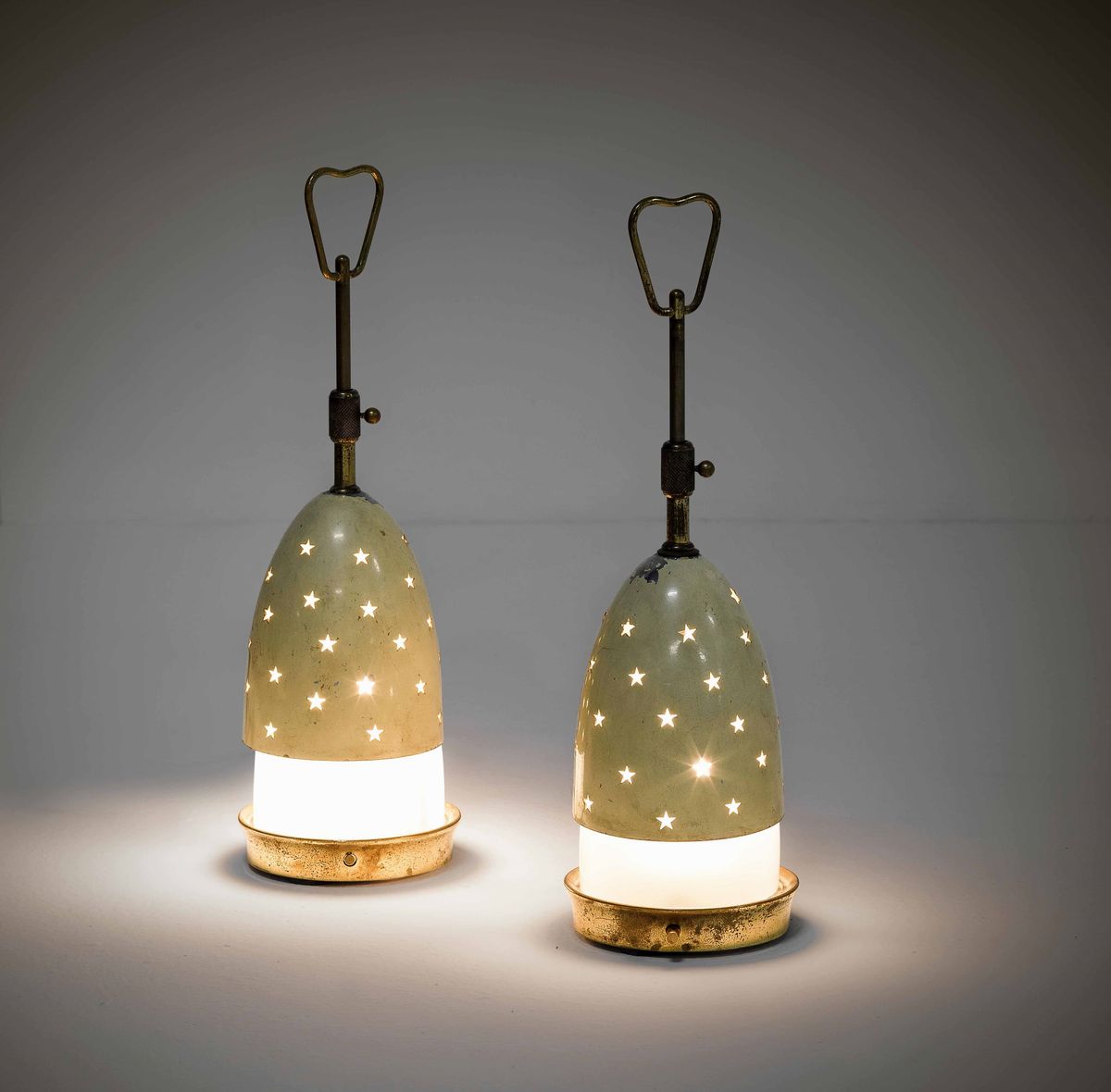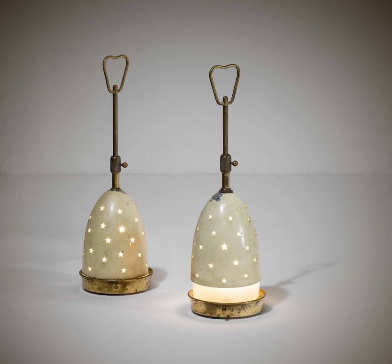 Coppia di lampade da tavolo con struttura in ottone e alluminio laccato, diffusore interno in vetro satinato.