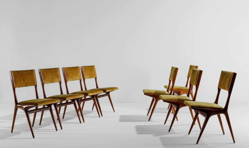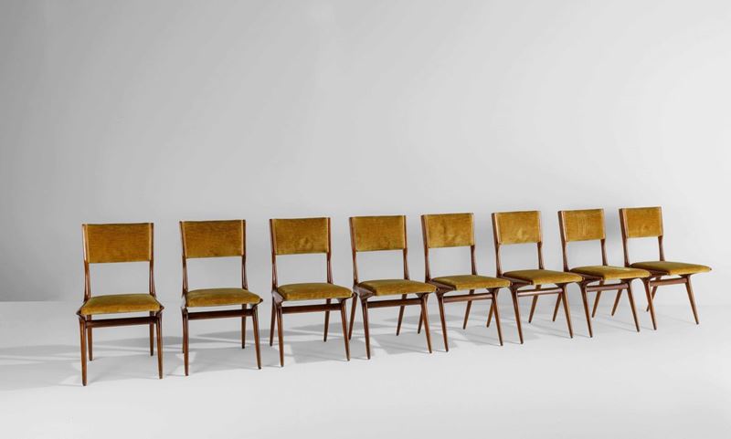 Otto sedie con struttura in legno e rivestimento in velluto.