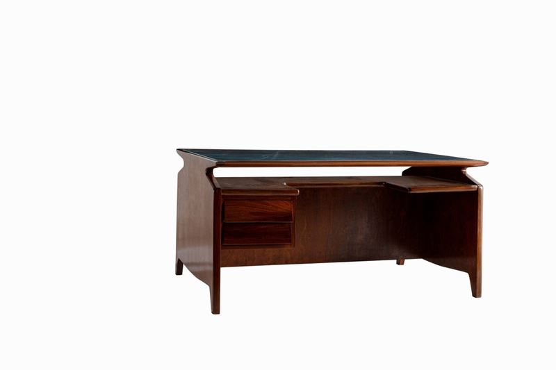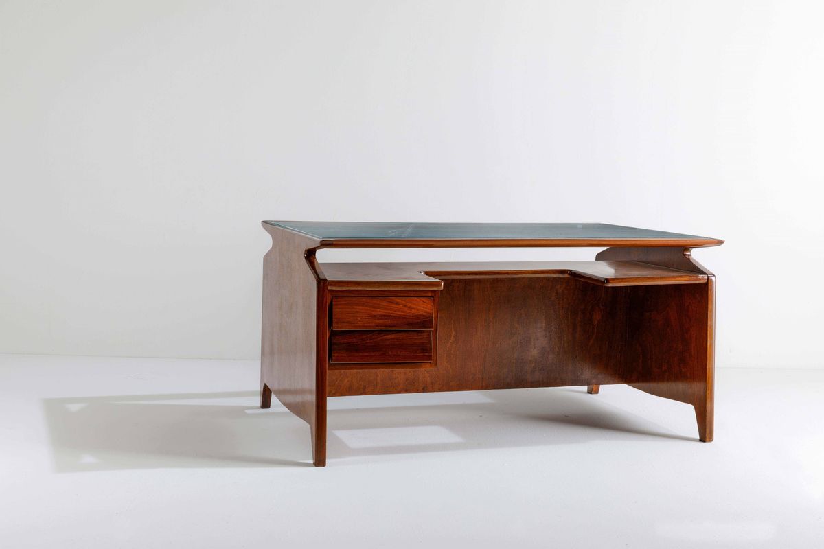 Scrivania con struttura in legno e piano in vetro.