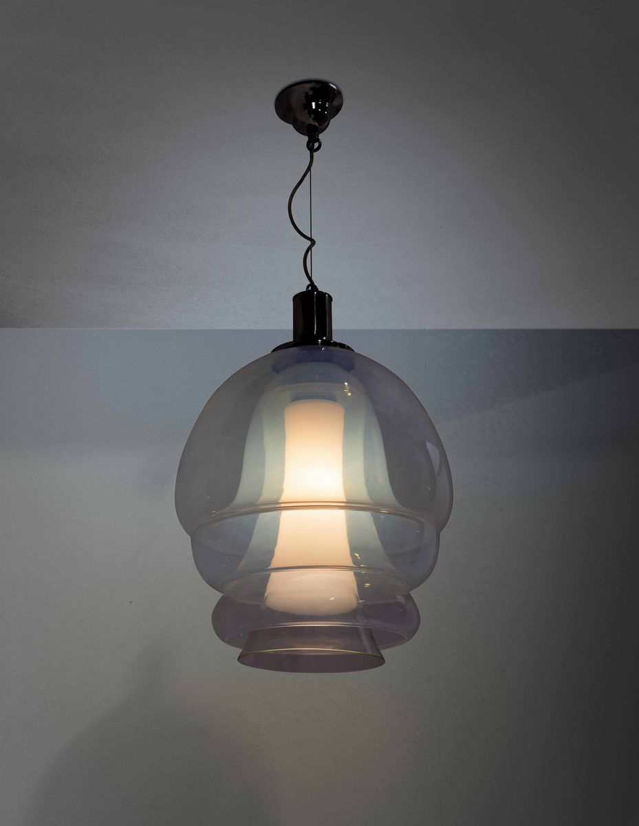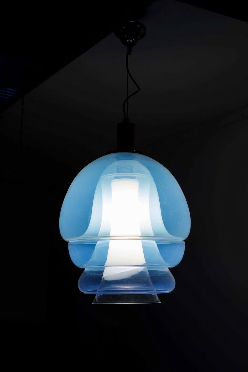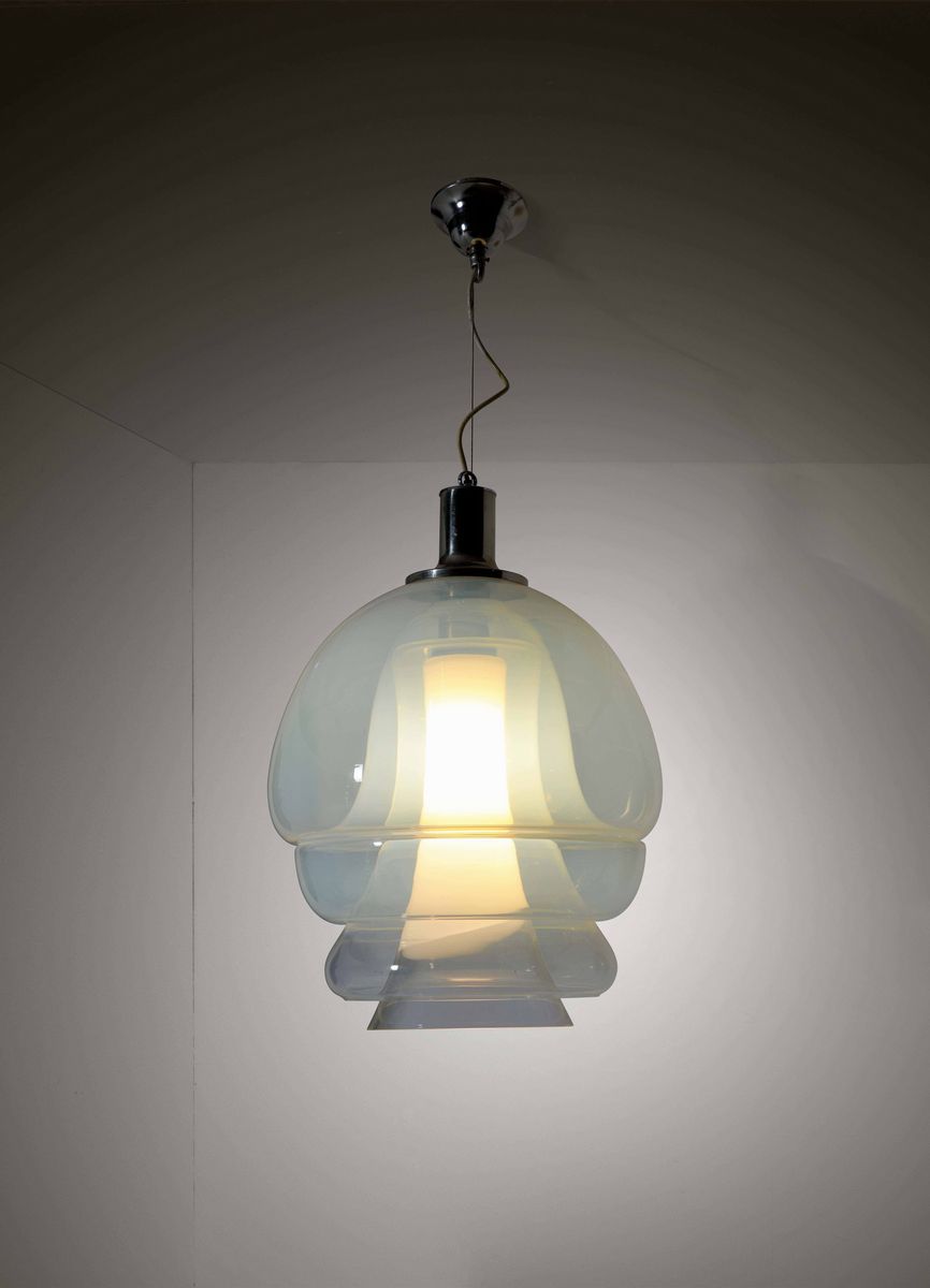 Lampada a sospensione mod. LS 134 in vetro di Murano opalino e particolari in metallo.