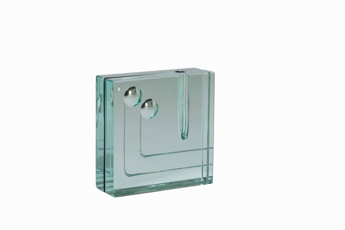 Vaso in cristallo molato di forte spessore, vetro specchiato e particolari in metallo cromato.