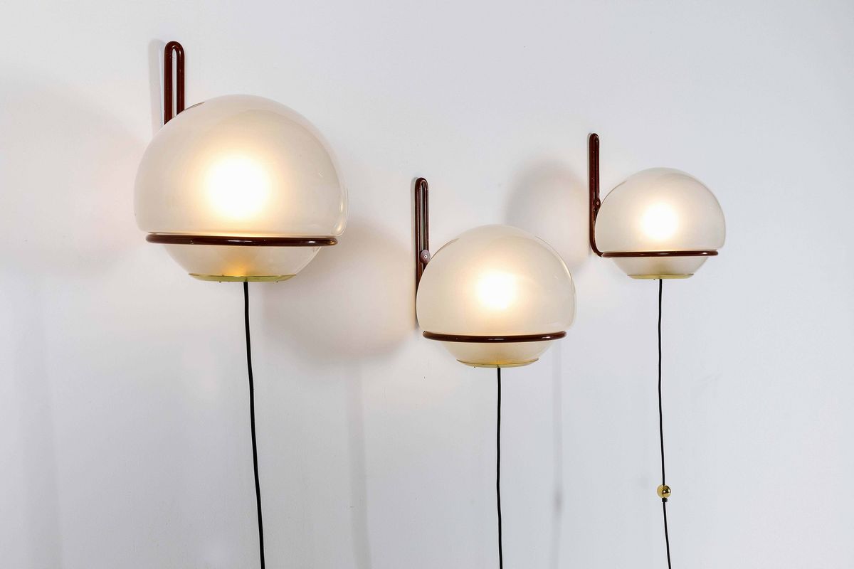 Tre lampade da parete mod. 146 con struttura in metallo laccato e diffusori in vetro sabbiato.