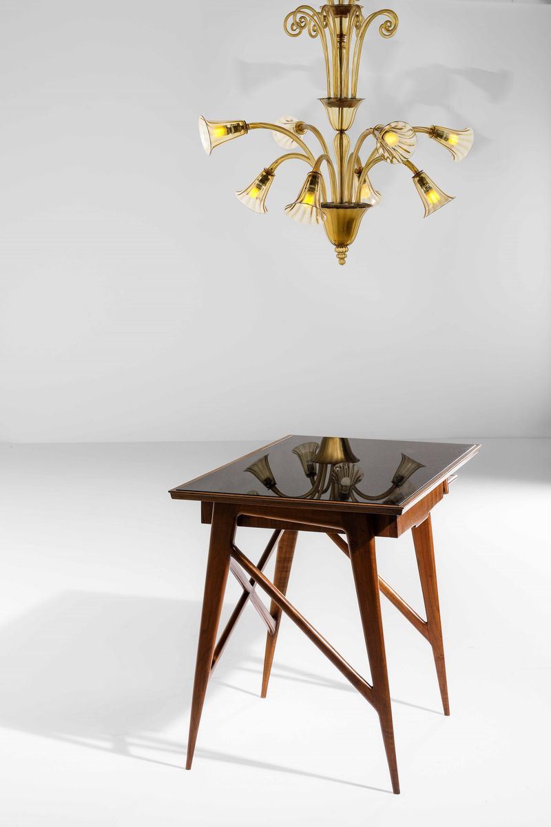 Scrittoio con struttura e sostegni in legno e piano in vetro.