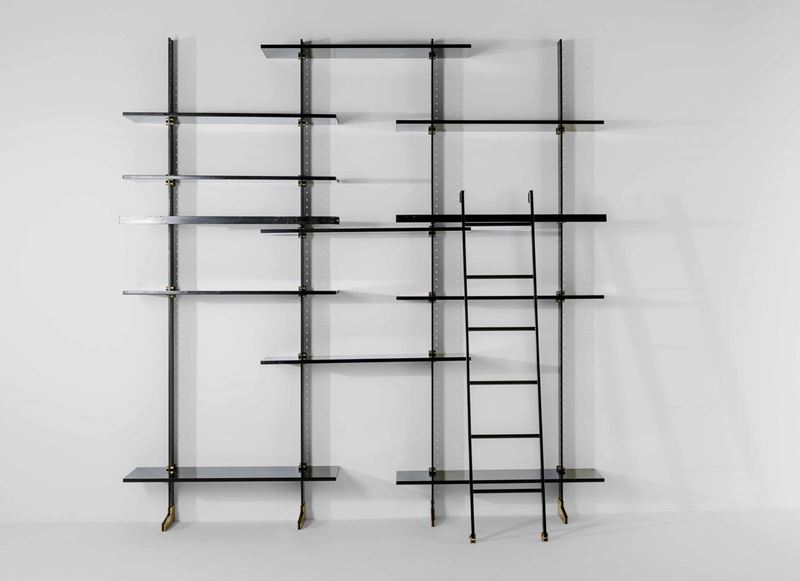 Libreria mod. Elegie con struttura in metallo laccato e ottone. Piani in legno laminato. Scala in metallo e ottone.