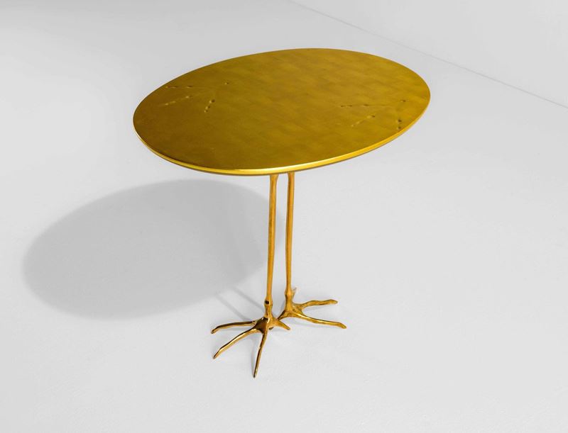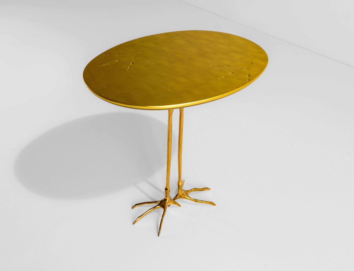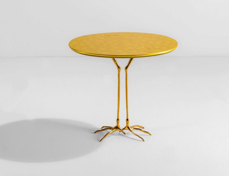 Tavolo mod. Traccia struttura in fusione di bronzo dorato e piano in legno foglia oro. Collezione Ultramobile.