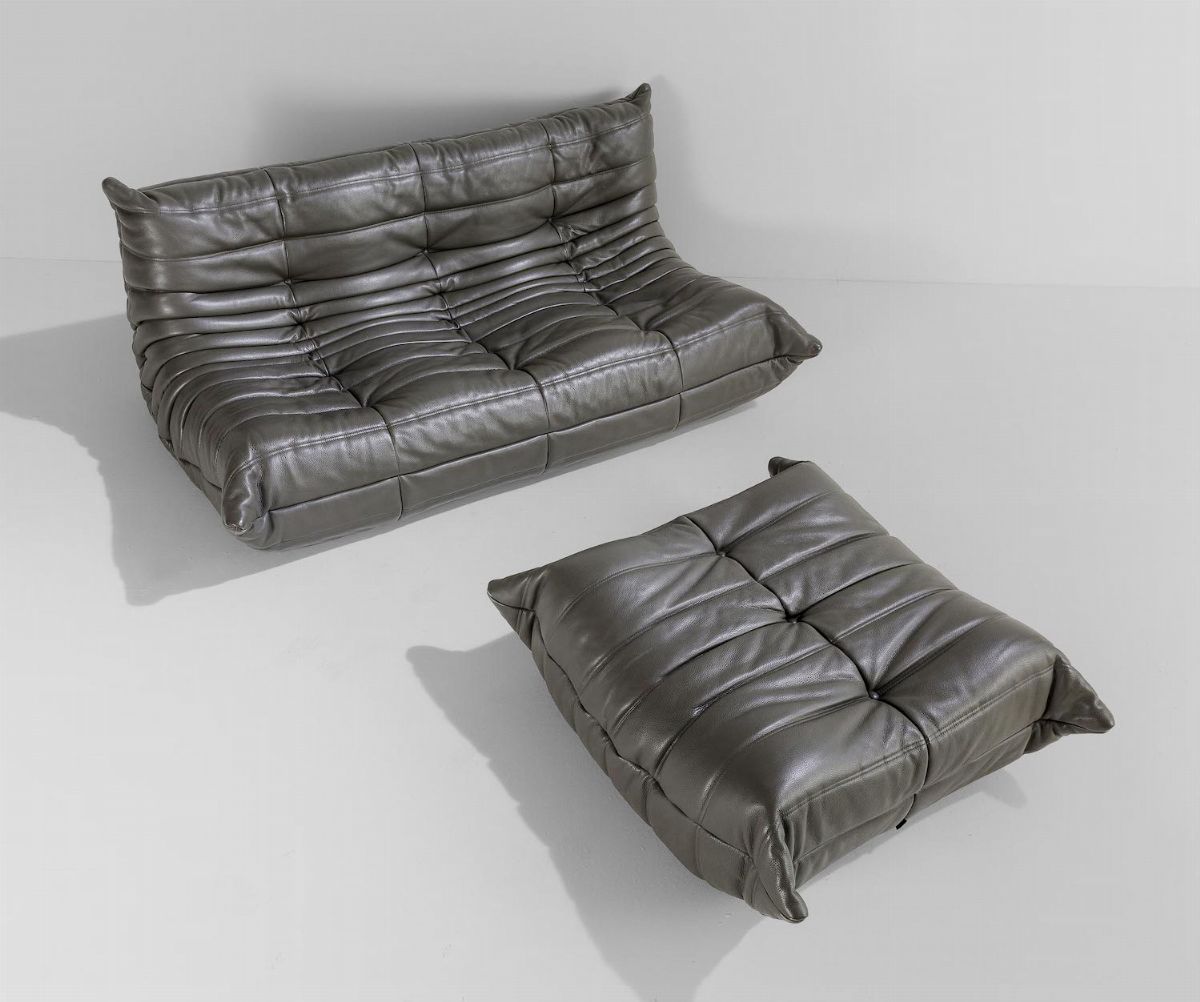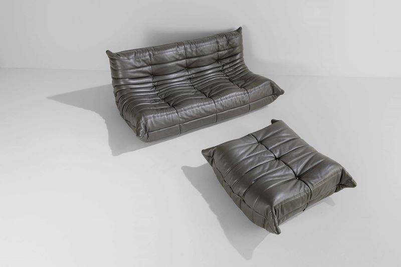 Divano e poggiapiedi mod. Togo con rivestimenti in pelle. Etichetta di produzione.