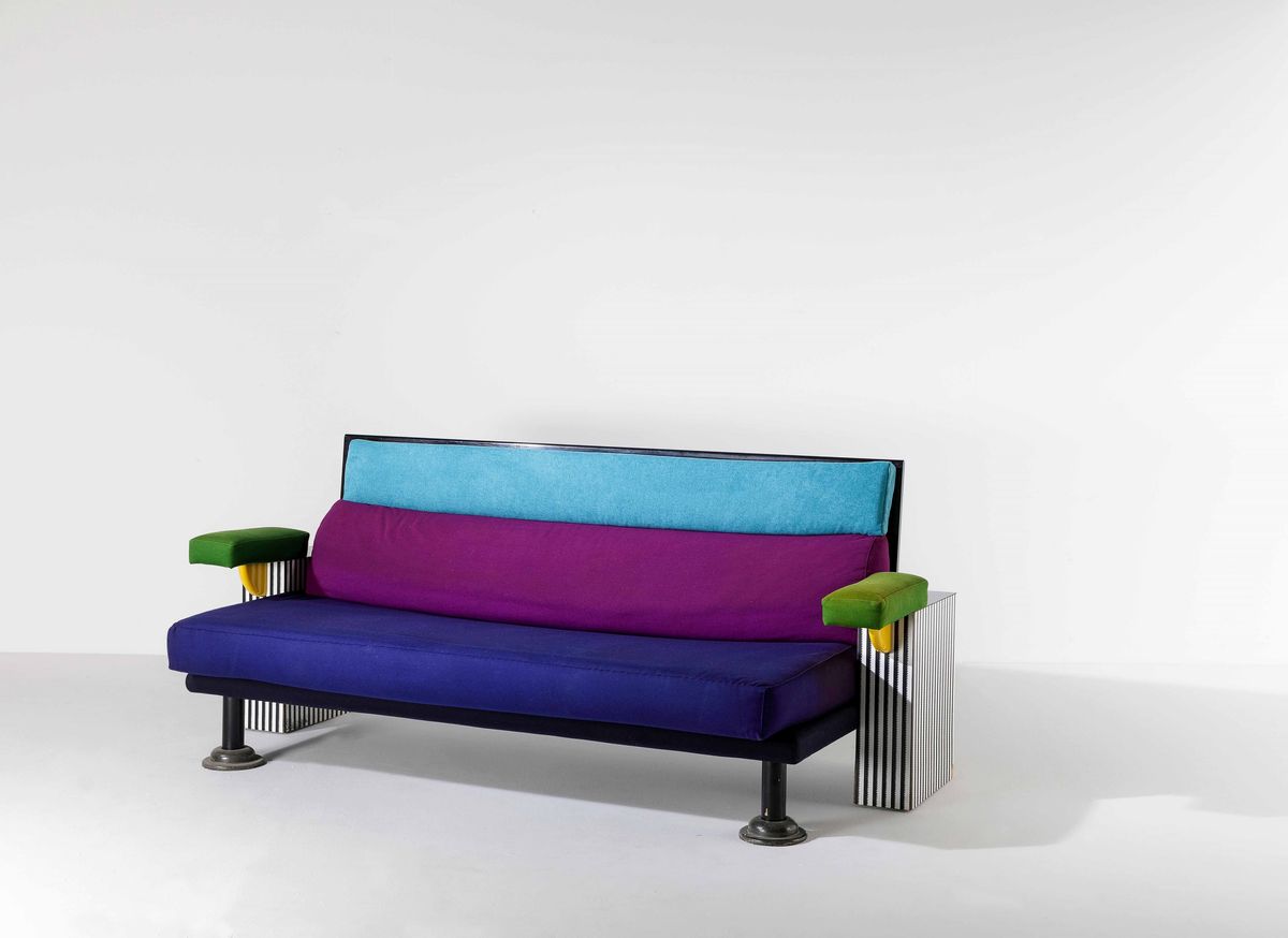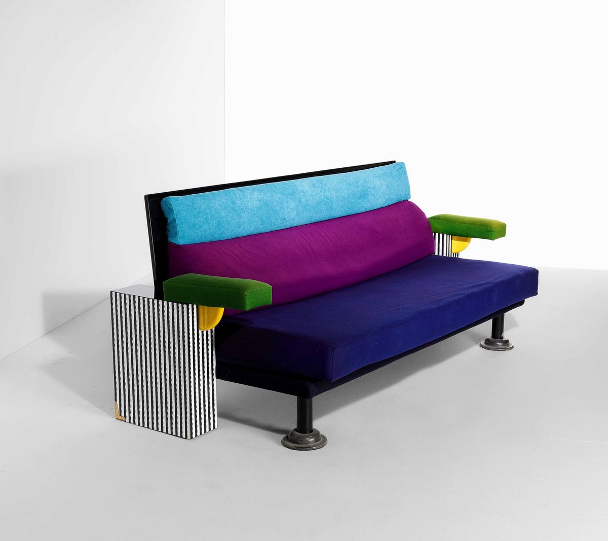 Divano mod. Lido in legno, laminato plastico e metallo. Rivestimenti in tessuto.