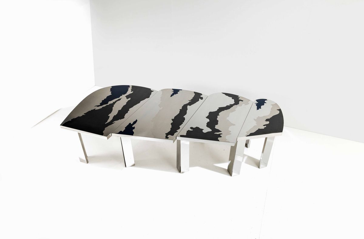 Tavolo scultoreo della serie Frammenti composto da quattro moduli. Struttura in acciaio intarsiato e acciaio.