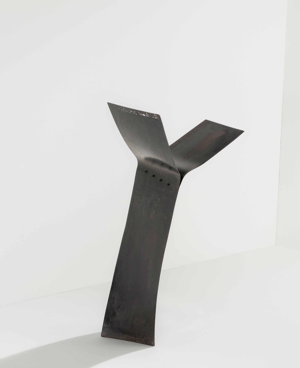 Scultura Leggio composta da una lastra di acciaio brunito trattato.