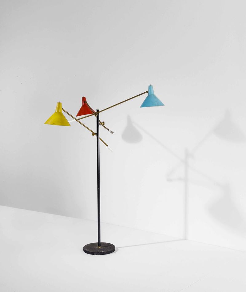 Lampada da terra con struttura in ottone e ottone laccato. Diffusori orientabili in alluminio laccato.
