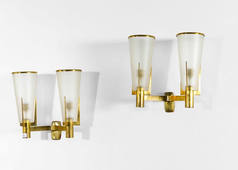 Coppia di appliques con struttura in ottone e diffusore in vetro sabbiato. Marchio originale.