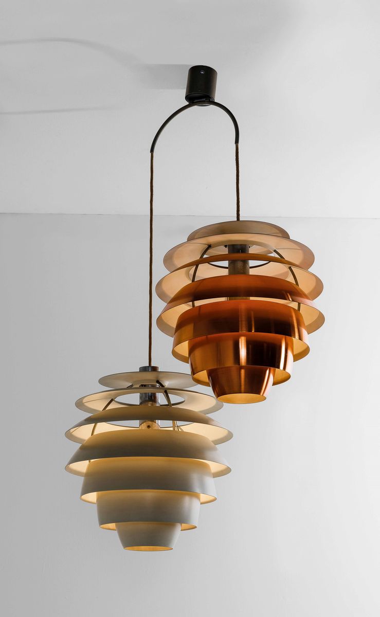 Lampada a sospensione mod. 1231 con doppio diffusore in metallo laccato e rame. Decalcomania originale.