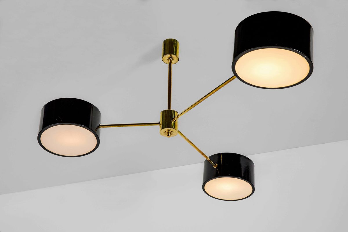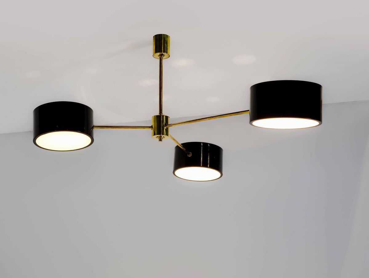 Lampada a sospensione con struttura in ottone e metallo laccato. Diffusore in vetro.