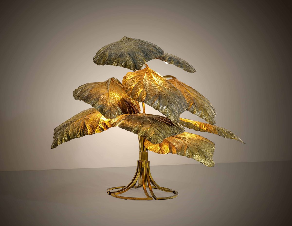 Grande lampada con struttura e riflettori in ottone e ottone cesellato.