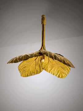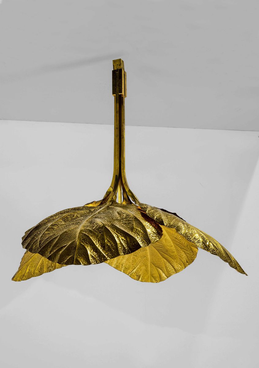 Lampada a sospensione con struttura in ottone e ottone lavorato.