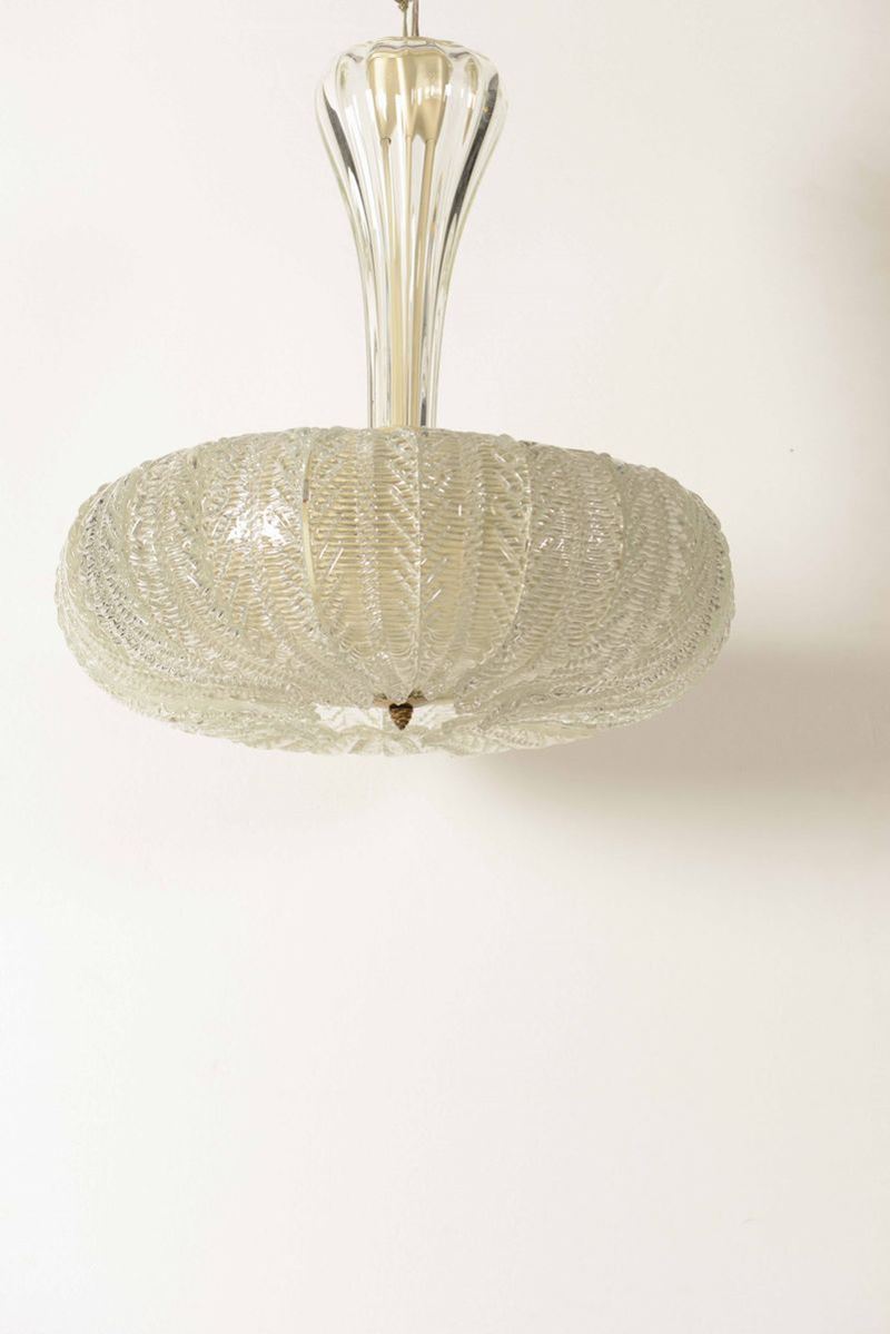 Due lampade a sospensione con struttura in ottone e elementi diffusori in vetro di Murano.