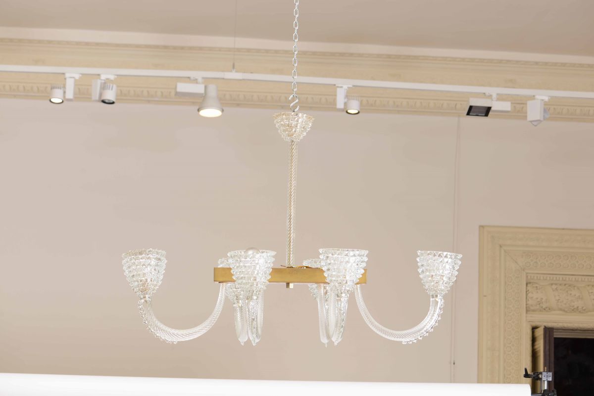 Lampada a sospensione con struttura in ottone, vetro di Murano e vetro di Murano rostrato.