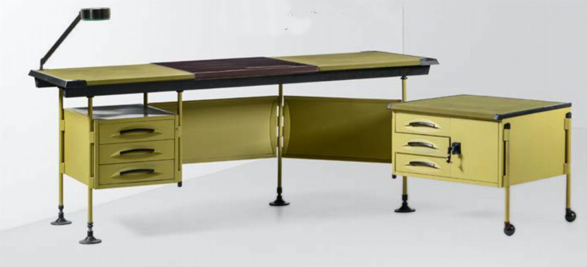 Scrivania con struttura in lamiera stampata e piani rivestiti in panno. Lampada a morsetto in metallo laccato con diffusore in plexiglass. Dettagli in materiale plastico.