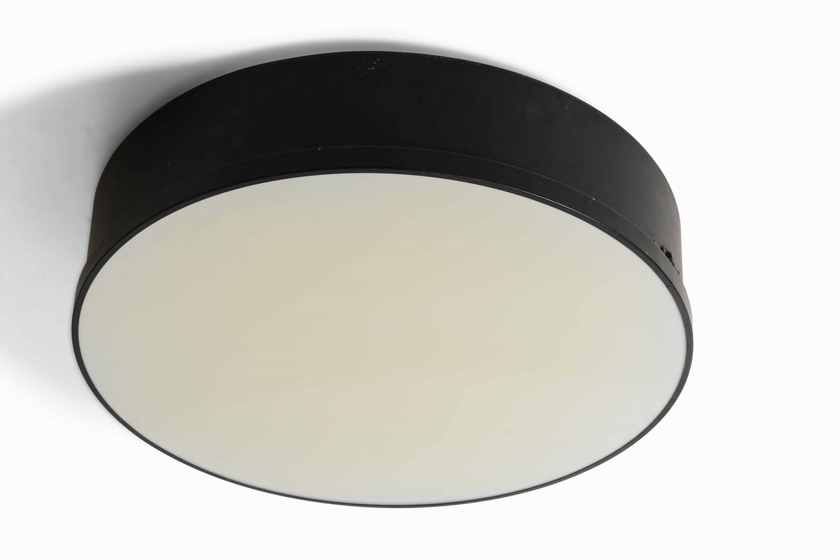 Grande coppia di lampade a plafone con struttura in metallo laccato e diffusore in plexiglass