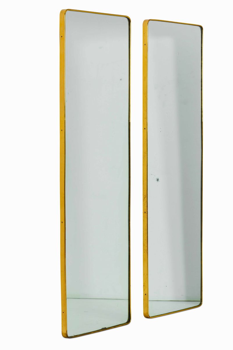 Coppia di specchiere a parete con cornice in ottone e vetro specchiato.