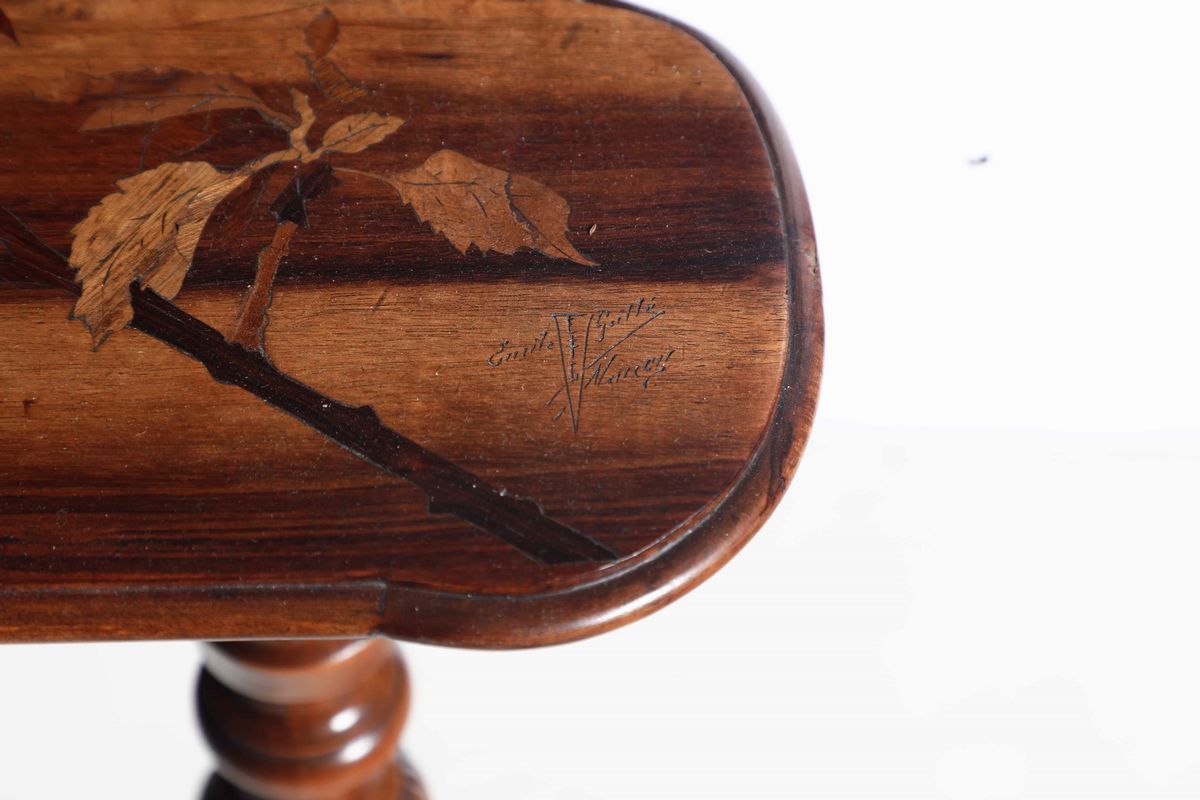 Tavolo secretaire con struttura, sostegni in legno e legno intarsiato. Firma originale.