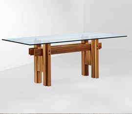 Tavolo rettangolare con struttura e sostegni in legno e piano in cristallo molato.