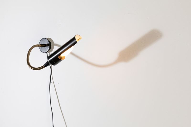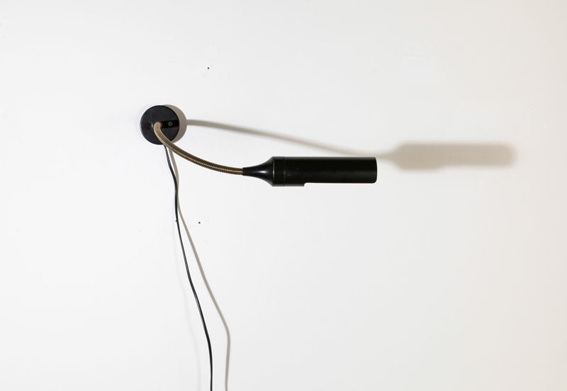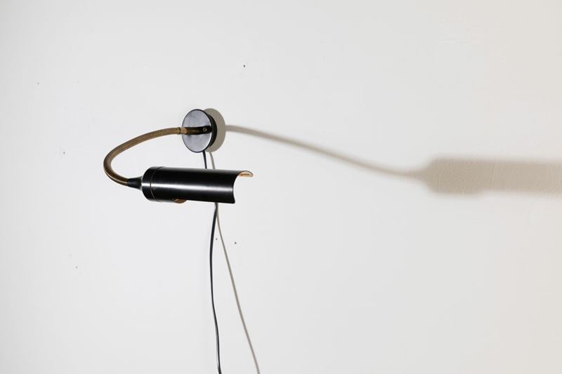 Lampada da parete mod. 595/p orientabile e flessibile con struttura in ottone e alluminio laccato. Decalcomania originale.