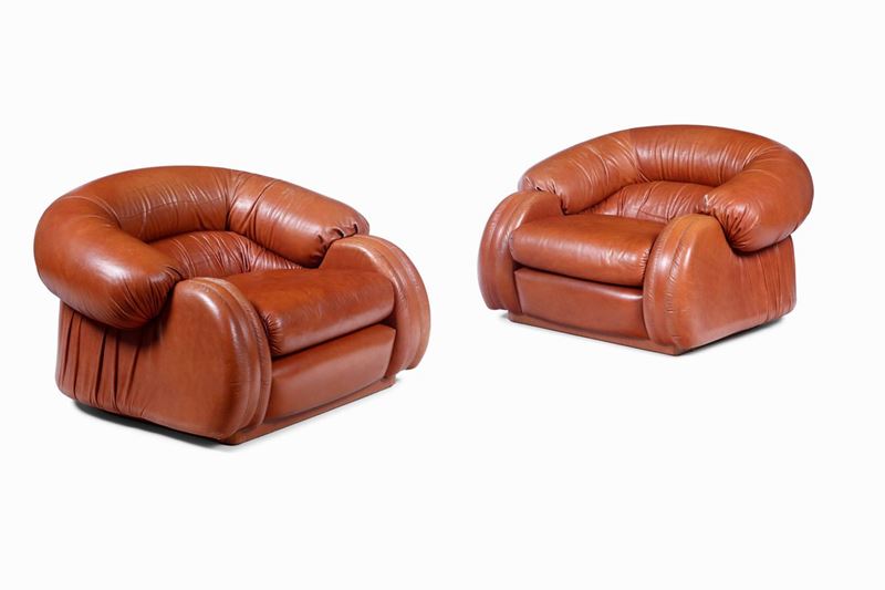 Salotto composto da divano e due poltrone con struttura in legno e rivestimento in pelle.