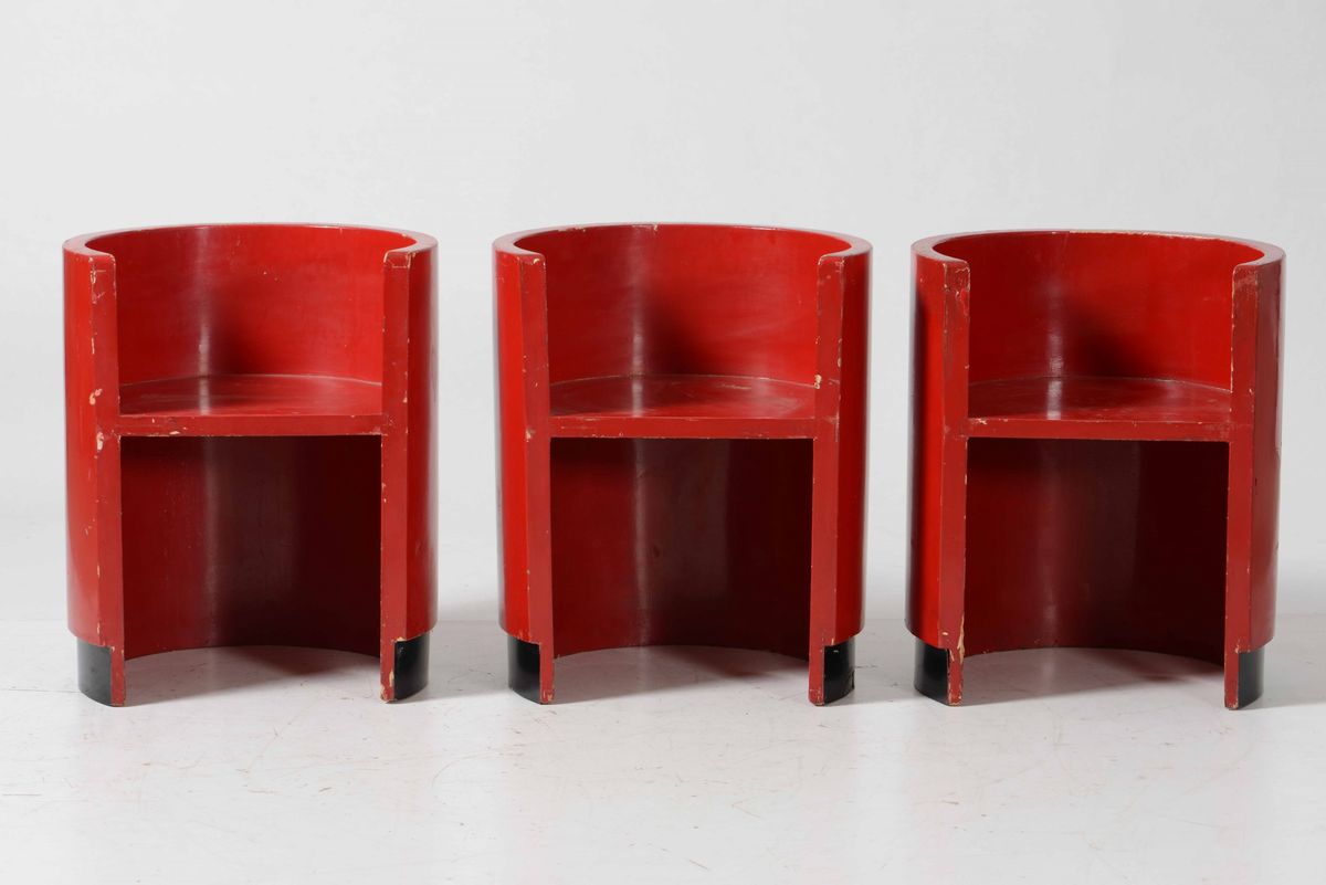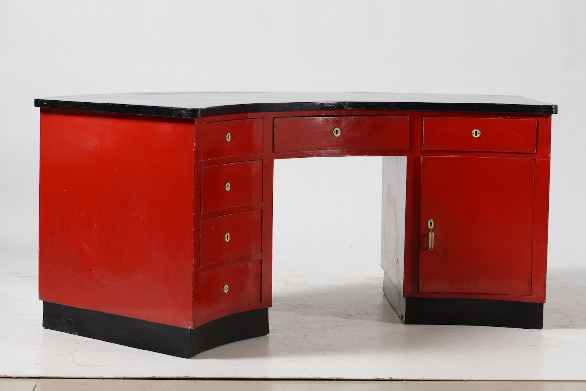 Set formato da scrivania curva e tre poltrone con struttura in legno laccato, piano in vetro.