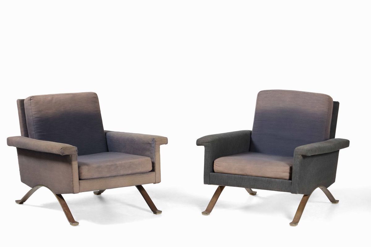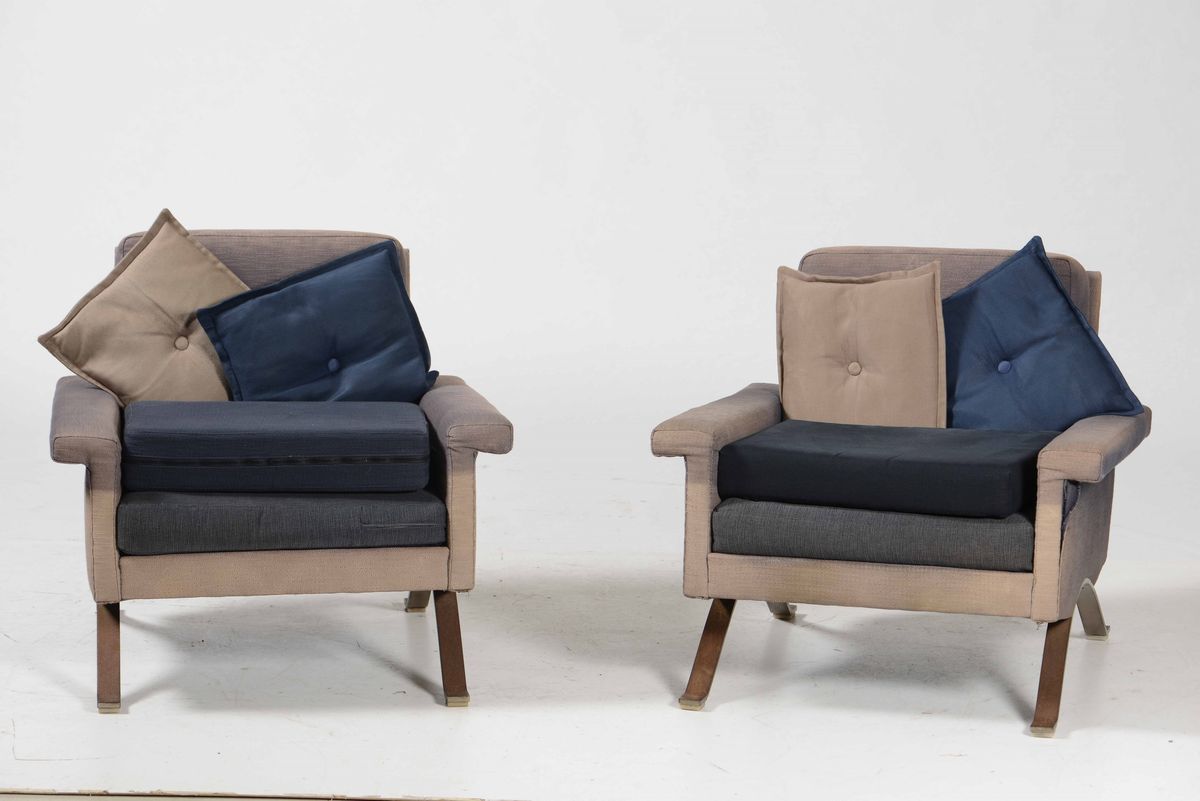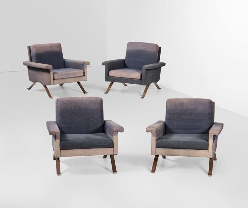 Quattro poltrone mod. 875 con struttura in metallo e rivestimento in tessuto.