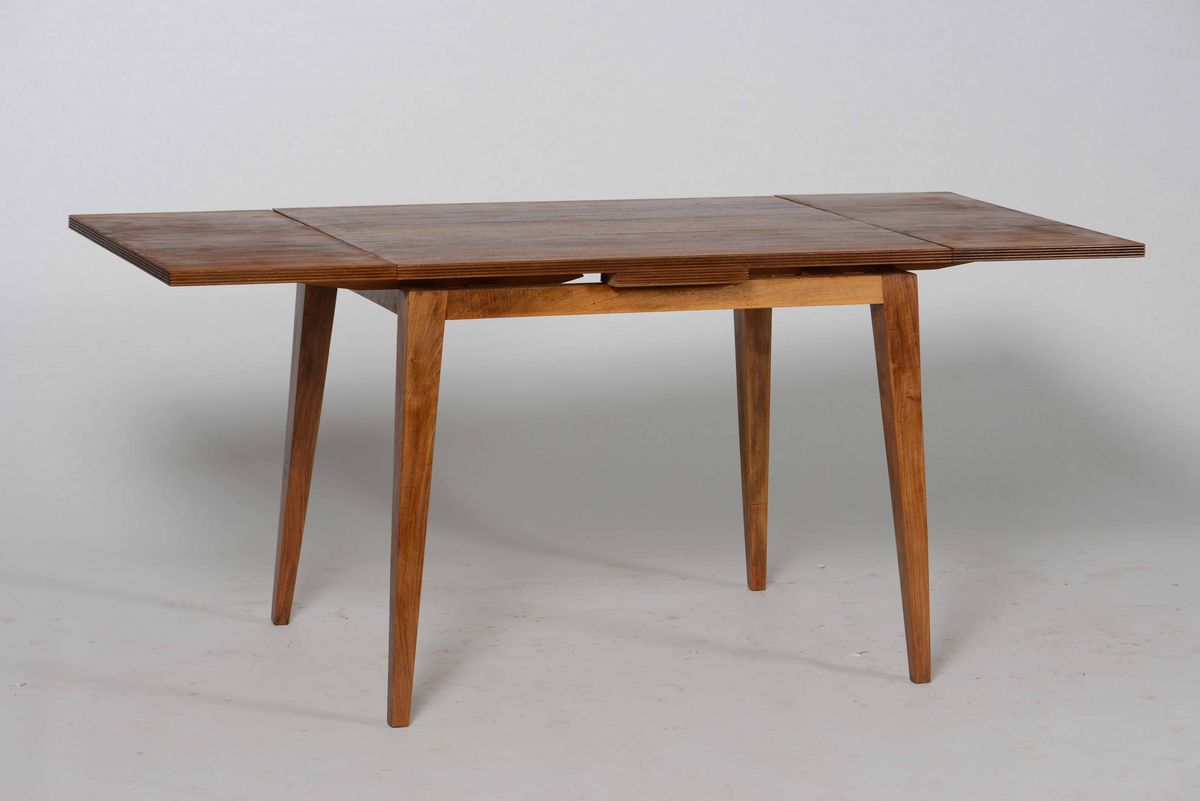 Tavolo convertibile con struttura, sostegni, piano in legno.