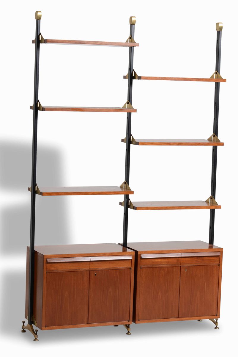 Libreria con struttura in metallo laccato, mobili contenitori e mensole in legno ad altezza regolabile e particolari in ottone.