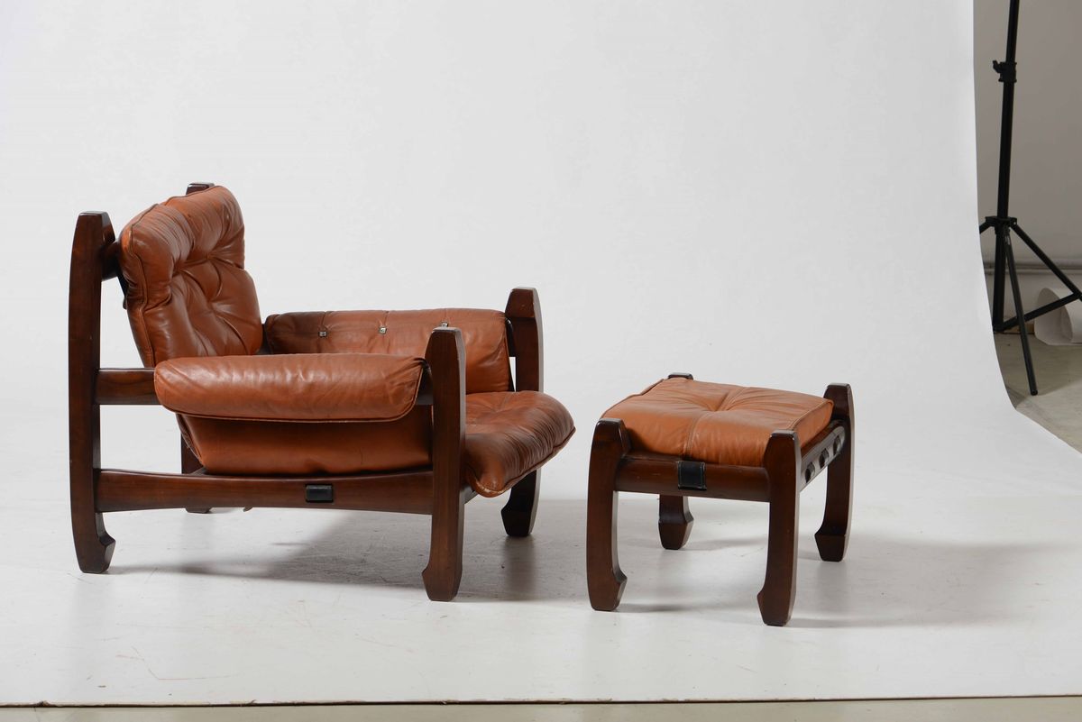 Coppia di poltrone e due pouf mod. Samurai con struttura in legno e rivestimento in pelle.