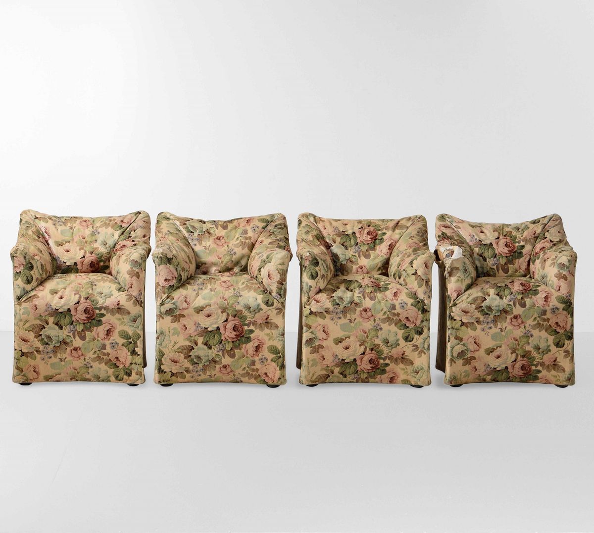 Quattro poltrone mod. 684 con struttura in metallo, poliuretano espanso e rivestimento in tessuto.