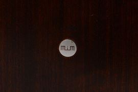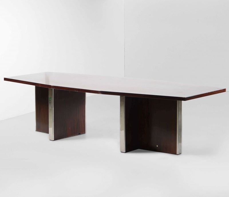 Grande tavolo con struttura, sostegni e piano in legno e metallo cromato.
