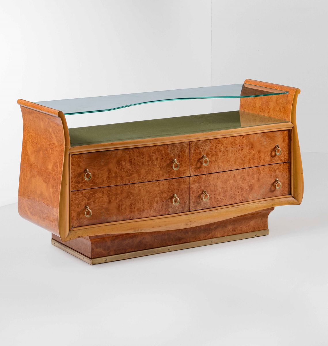 Mobile contenitore a cassettiera con struttura in legno, piano in cristallo colorato e in cristallo molato e sagomato, particolari in ottone.