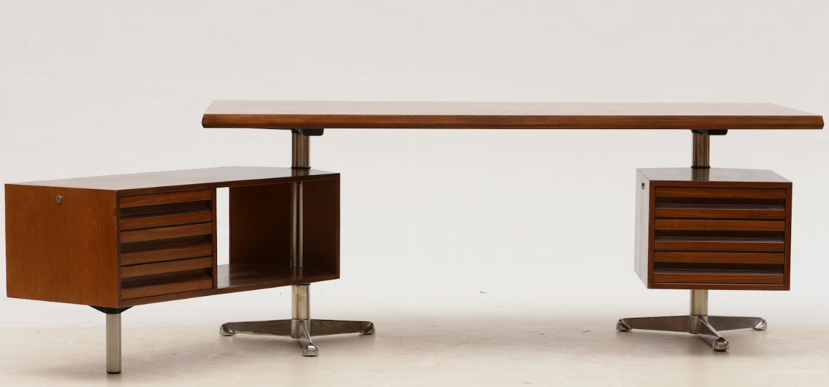 Scrivania direzionale mod. T95 cassetiere girevoli in legno, con struttura in metallo. Piano in legno.