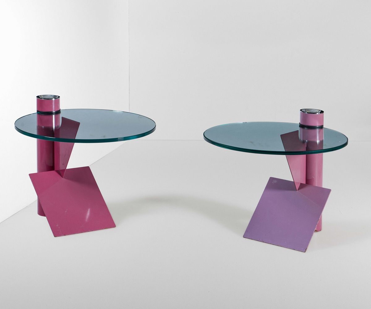 Due tavoli bassi con struttura in metallo laccato e piano in cristallo molato.