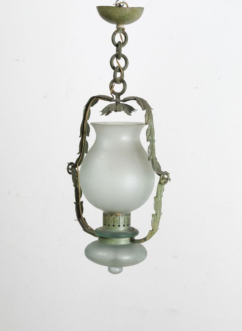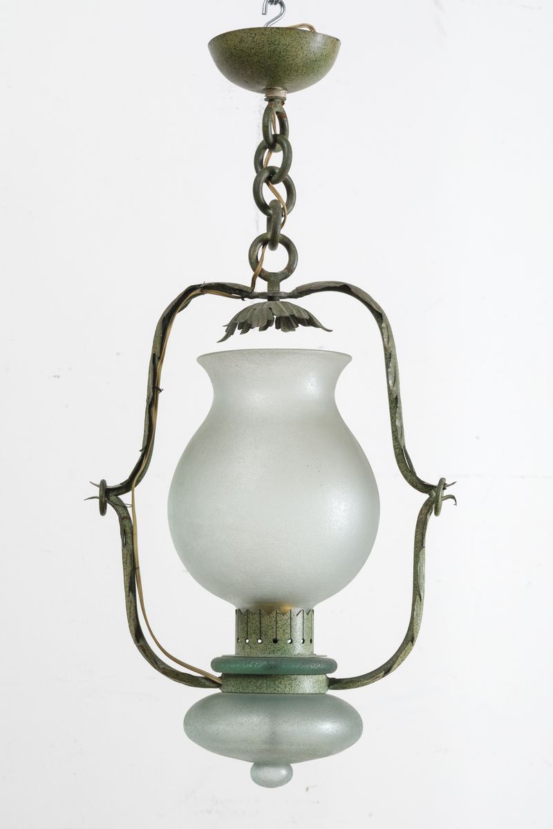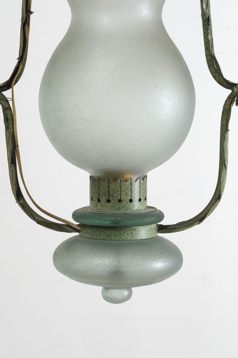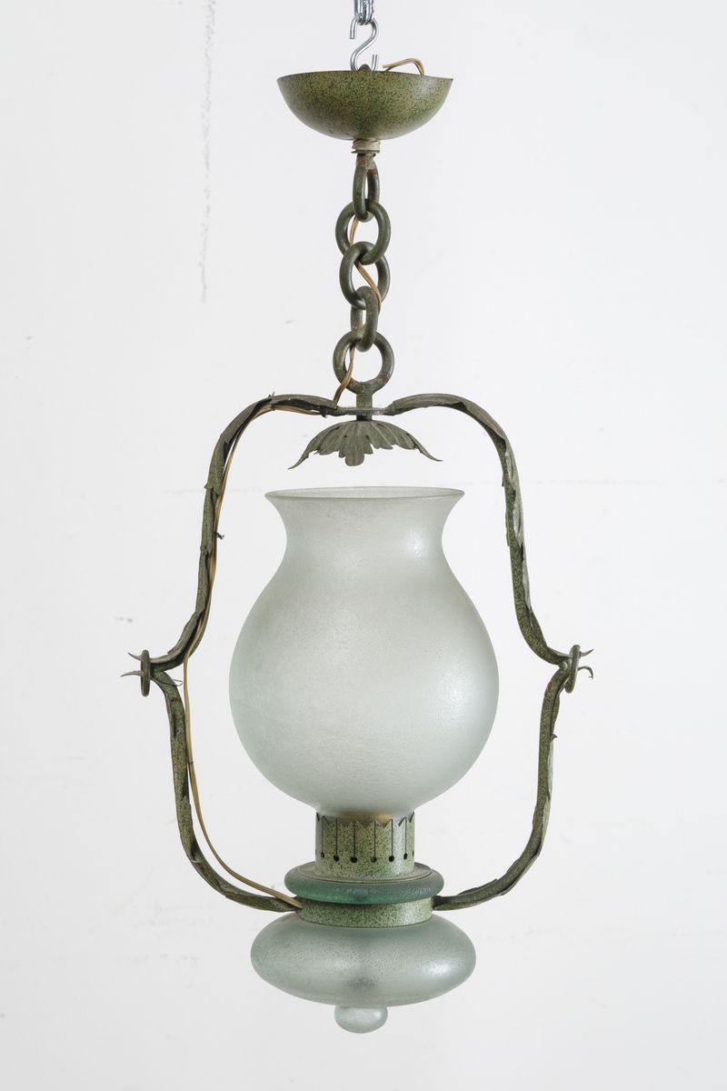 Lampada a sospensione con struttura in ottone, ferro patinato e bronzo. Diffusore in vetro di Murano Corroso e verde d'acqua.