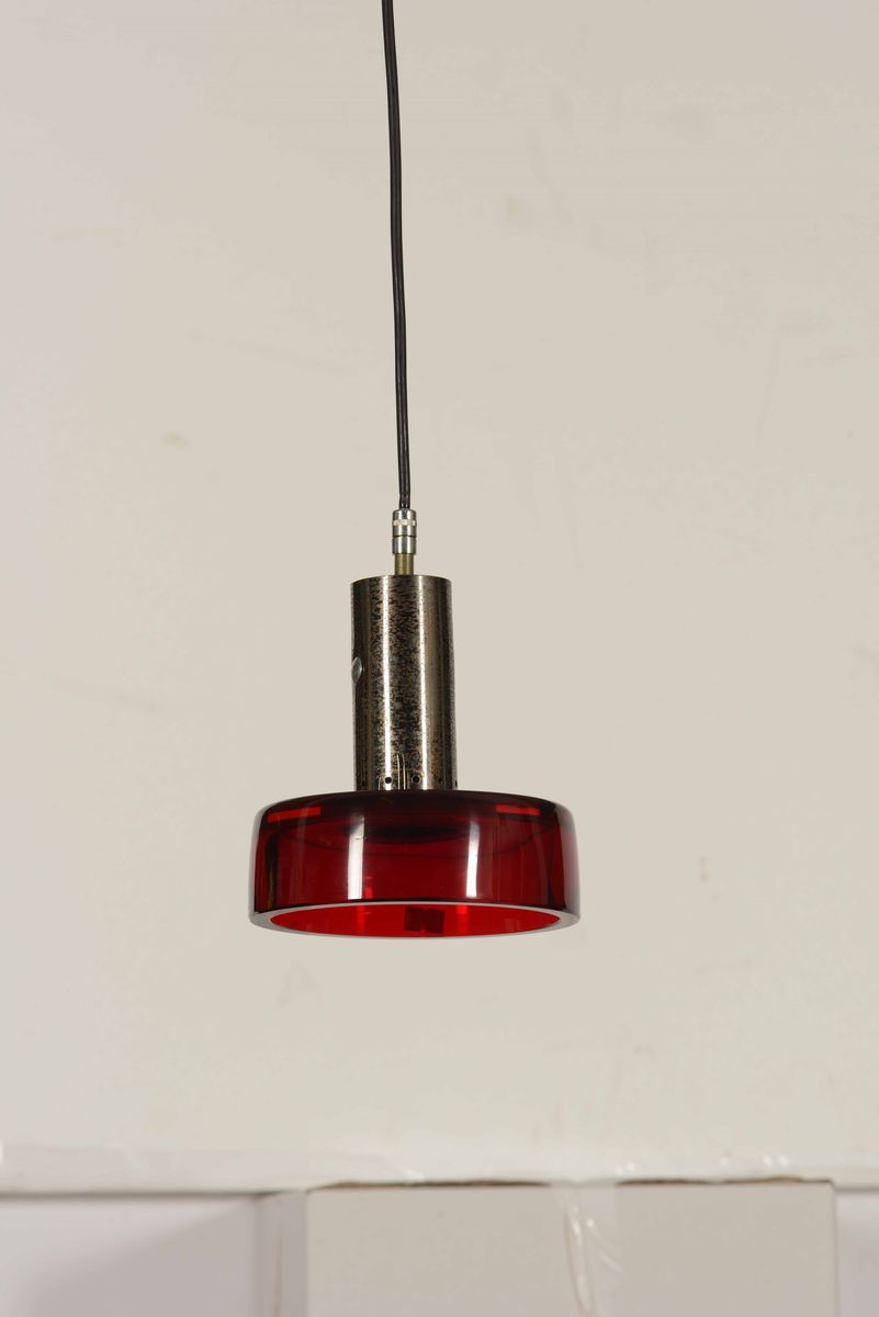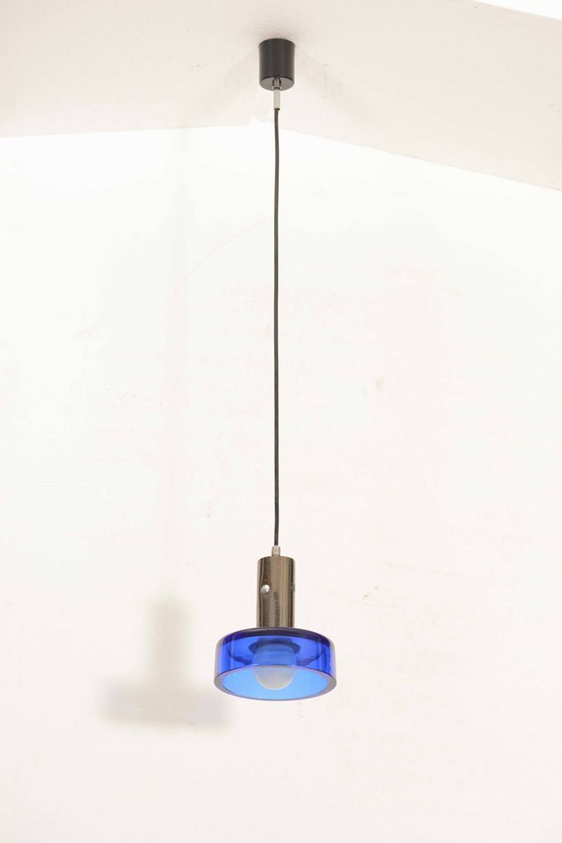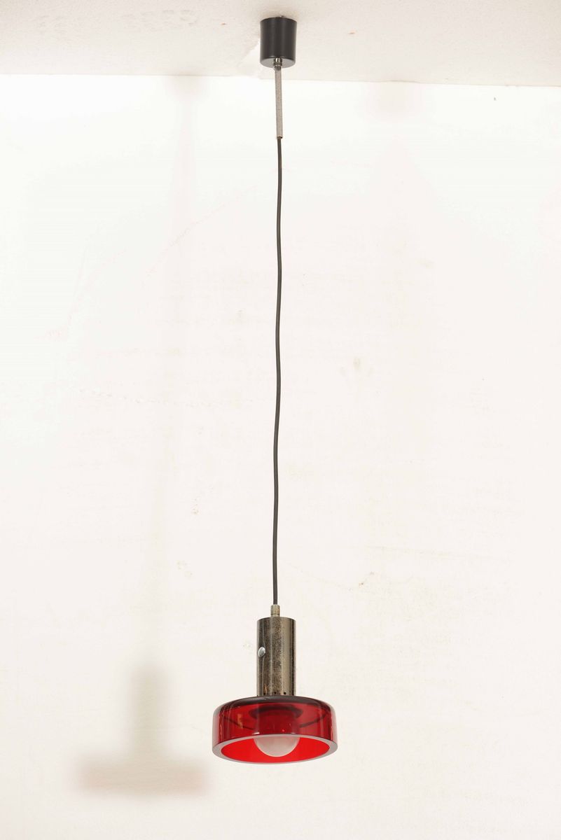 Quattro lampade a sospensione con struttura in metallo cromato e diffusore in vetro molato colorato.