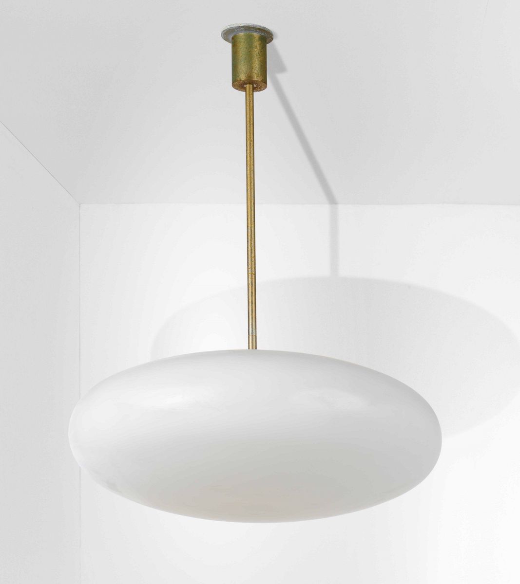 Lampada a sospensione con struttura in ottone nichelato e diffusore in vetro opalino.