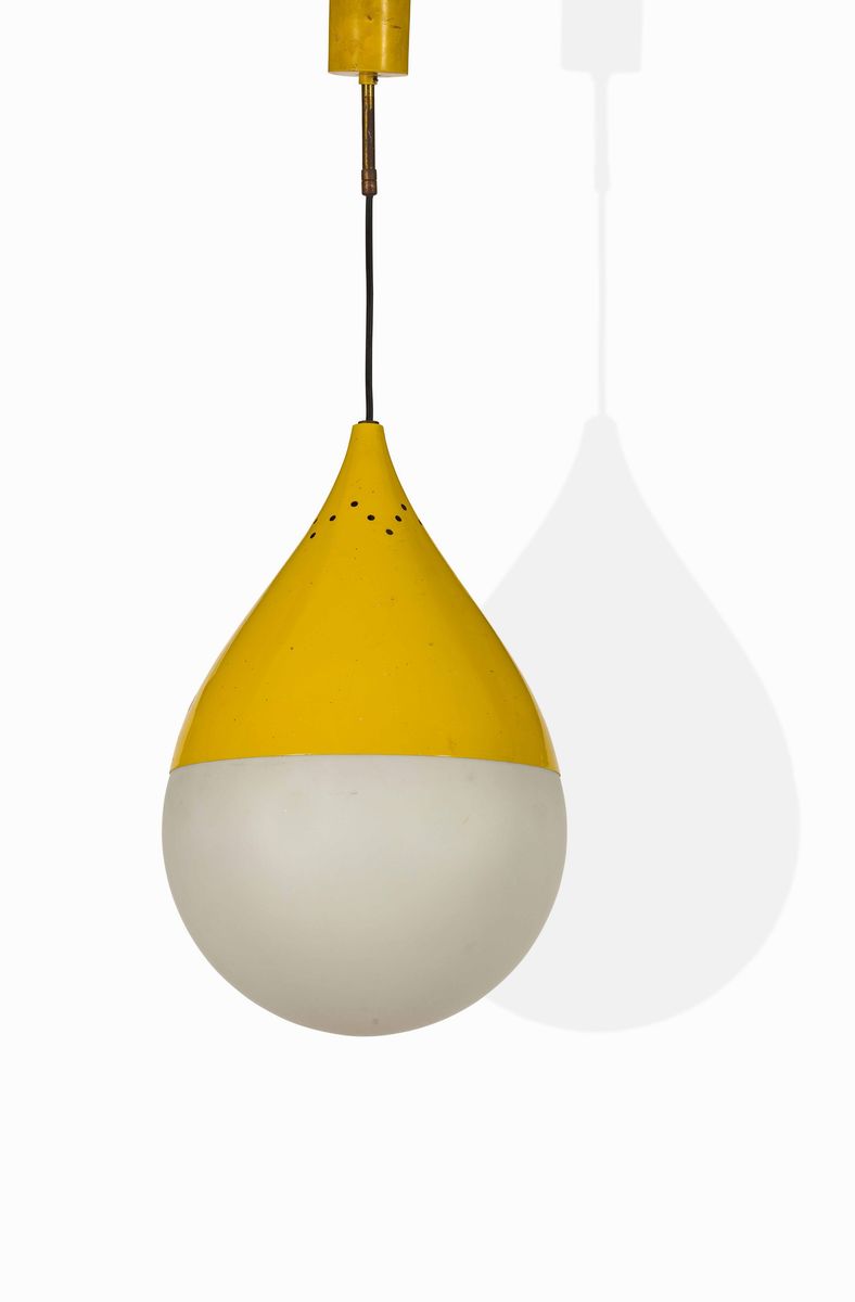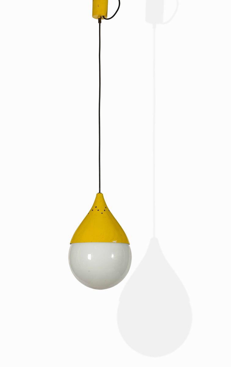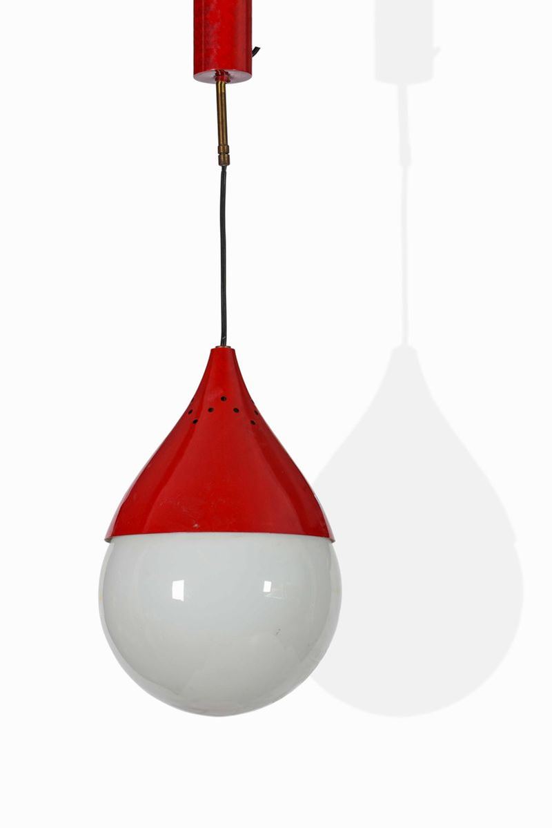 Quattro lampade a sospensione, altezza regolabile, diffusore in metallo laccato e vetro opalino, particolari in ottone.